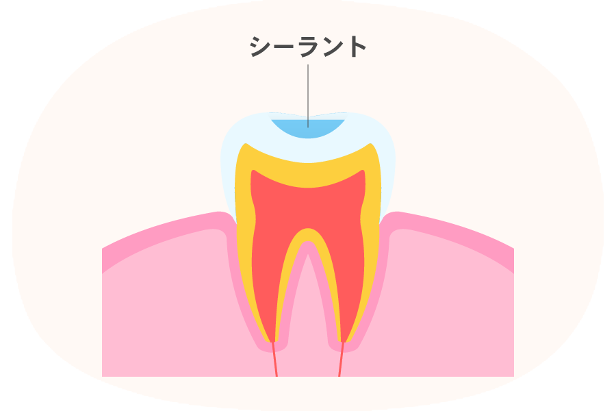 シーラントとは、むし歯になりやすい奥歯の溝を歯科用プラスチックで埋めて、むし歯菌の感染を防ぐ方法です。奥歯が生え始めたらすぐにシーラントでフタをしてあげることで、むし歯菌から歯を守ることができます。ただし、時間が経つとむし歯菌がすき間に入りやすくなるため、定期的なメインテナンスが必要です。