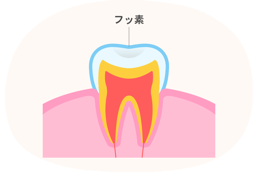 フッ素はむし歯予防に非常に効果的な成分で、「歯の再石灰化を促す」「歯質を強くする」「むし歯菌の活動を抑制する」という3つのはたらきで歯を守ります。もともと自然界に存在しており、お茶や魚介類にも含まれています。歯科医院では市販品よりも高濃度のフッ素を使用できるため、定期的な塗布で高いむし歯予防効果が期待できます。